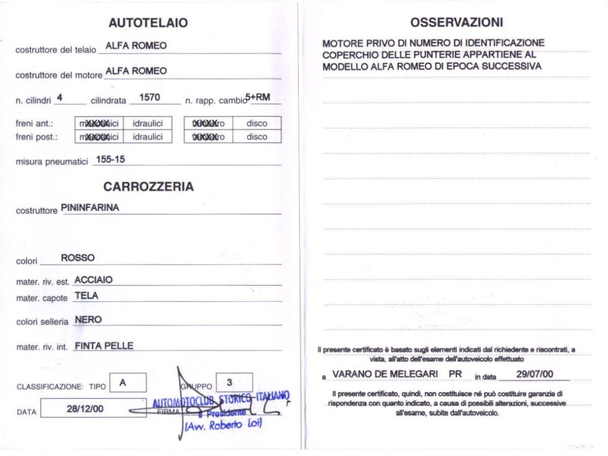 Gli esemplari ben conservati, con targhe originali e certificazioni storiche, come questo, rappresentano oggi una delle configurazioni più desiderabili nel mercato delle Alfa Romeo classiche.