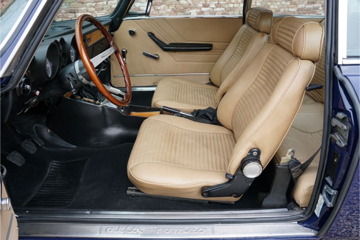 “Blu Ollandese” is most probably the prettiest colour for a 105 series Alfa Romeo, especially when it also has that delicious 2000 engine with twin Weber Carburettors. This car was first allowed on the road in America in 1974. The car has been fully restored to the highest standard. The unblemished bodywork looks fantastic. The nice and thin panelwork is correctly aligned The perfectly applied “Blu Ollandese” paintwork is simply brilliant. The brightwork too is in very good condition. It has perfectly complimentary black carpet and tan vinyl upholstery. During its restoration the 2000 GTV was re-upholstered and has remained pristine. The customary wooden steering wheel and long gearstick are also present. Ergonomically speaking this Alfa Romeo is unusually un-Italian in that it is good. You immediately find the right driving position when you sit down. It is therefore no surprise the 2000 GTV has remained a firm favourite classic. It delivers great entertainment when being driven sportively as well being perfectly able to transport you in all comfort over longer distances. The neat condition of the dashboard deserves a mention, with all gauges, controls and switches working as they should. The 2.0 litre 4-cylinder engine with double overhead cams delivers 132 Ps at 5,500 revs attached to its manual 5-speed gearbox. The engine has no trouble at all propelling this 1,028 kg light Italian coupé. This car sporting its iconic turbine rims is ready to go. It comes with a copy of the original Alfa Romeo owners manual.