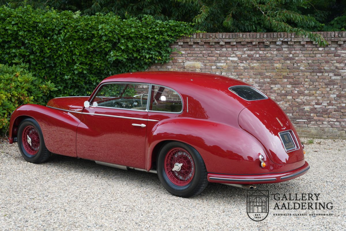 Between 1947 and 1950, approximately 2,500 6C 2500’s were built, of which only 680 being the model you see here: the 6C 2500 Sport Freccia d'Oro, which means "Golden Arrow." This model was able to compete amongst the absolute top at the time. The body was no longer bolted to the chassis but welded to it. This was completely new and was first applied to the Freccia d'Oro by Alfa Romeo.