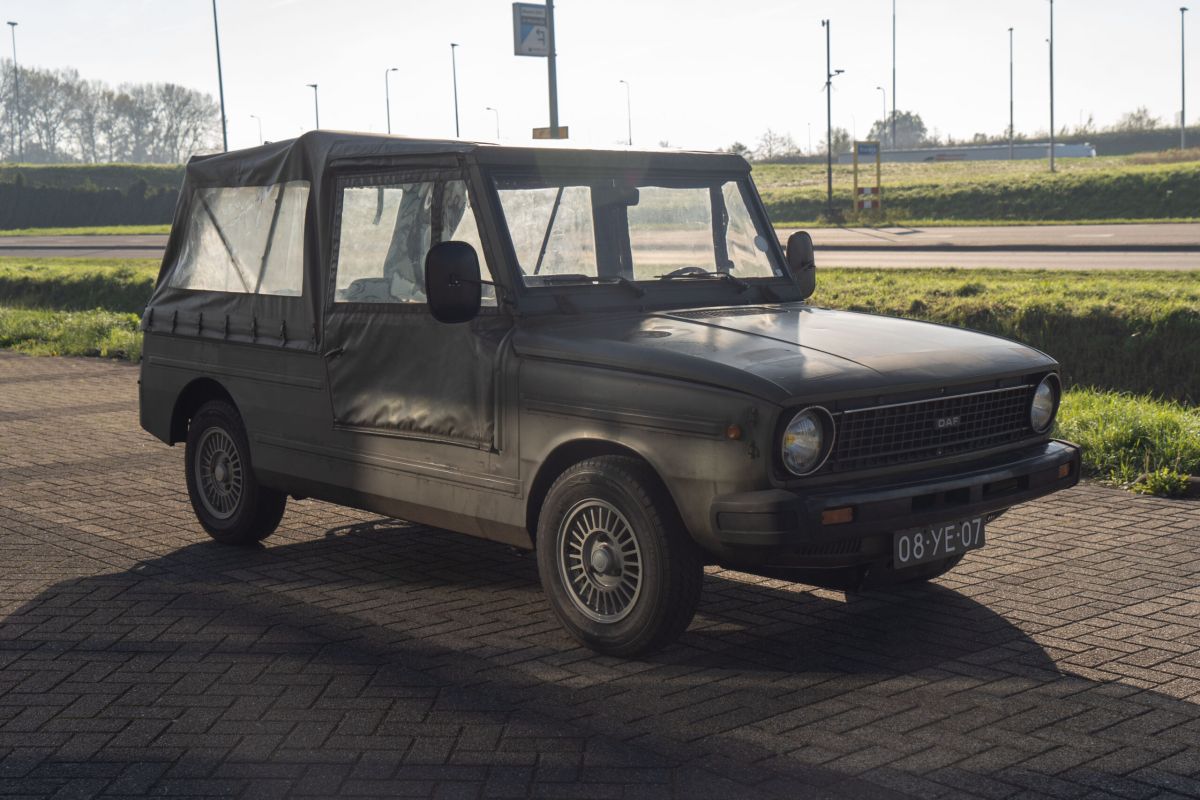 The DAF has dark green paint with some patina and signs of wear. The synthetic leather interior seats show some wear as well. It comes with a soft top that fully encloses the vehicle, including the doors.
