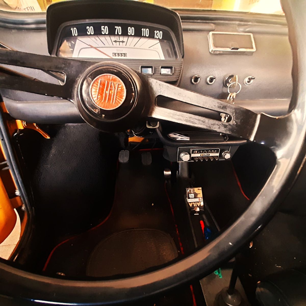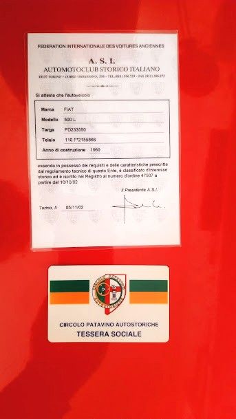 L'auto ha il suo corredo completo di documenti originali del '69 : carta di circolazione, libretto uso e manutenzione, libretto consigli agli utenti nonché manuale Fiat Service. Iscritta Asi nel 2002. Scadenza revisione 2/2026. Targa originale. Autoradio d'epoca.