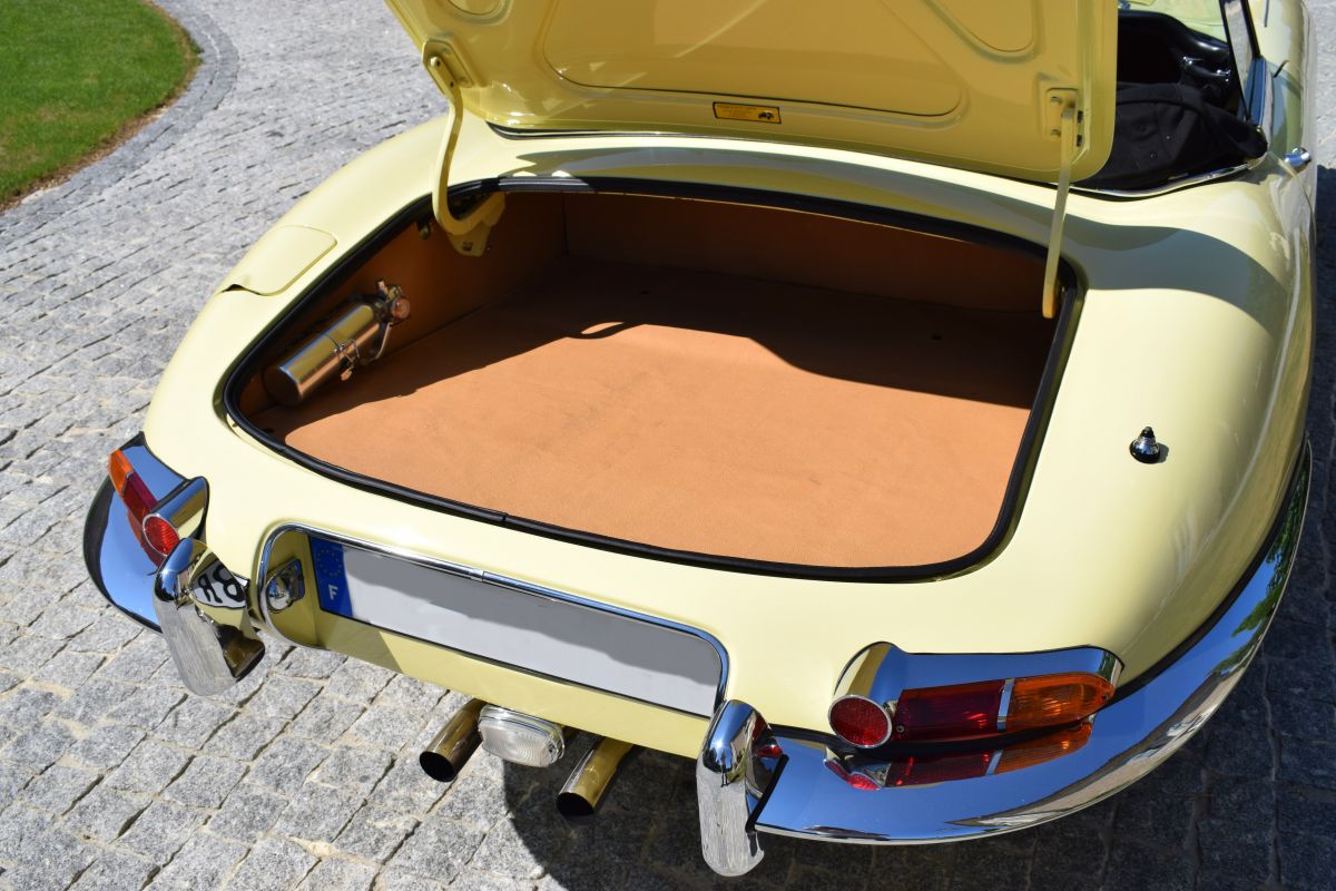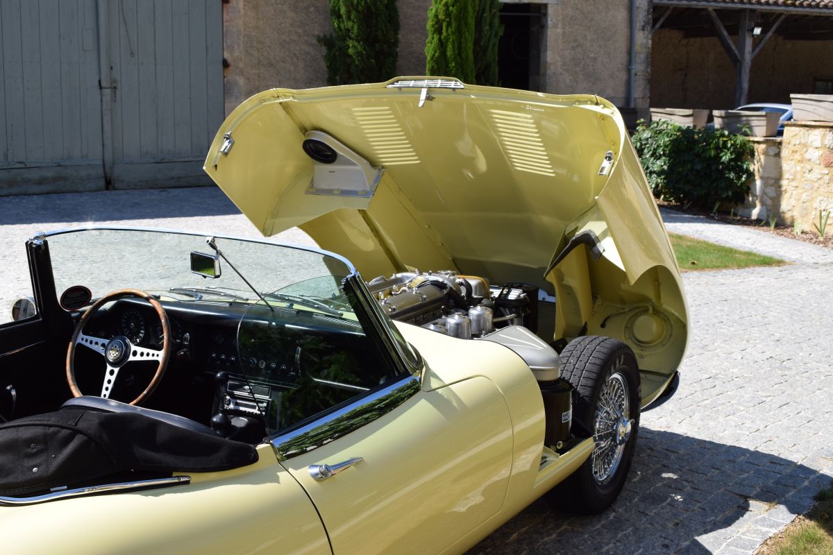This Jaguar E type Chassis number 1E 10387, is a genuine European specification car with Heritage Certificate, being delivered to the German distributor Peter Lindner of Frankfurt and then to its first owner a Mr Venzay Amlh on the 20 January 1965. In 2006 the vehicle was then with the second owner, a Ms Arena Marcello of Italy and then transferred to her husband, Mr Fratini Marcello in 2007. We are told the car was maintained regardless of cost, this is reflected in the documents showing that the car was presented for roadworthiness test every year. The car originally being black has undergone a bare metal respray undertaken by Francesco Lotti of Scarlatti Italy. The car also boasts the professional installation of power steering we believe by Jaguar specialists Vicarage Carriage Co. at a cost of £10,000 making this E type a delight to drive especially at parking speeds. During the respray period it is obvious that the car has had a lot of money spent in other areas, such as new wire wheels, retrim in the luggage area, new Mohair hood and lots of mechanical work.