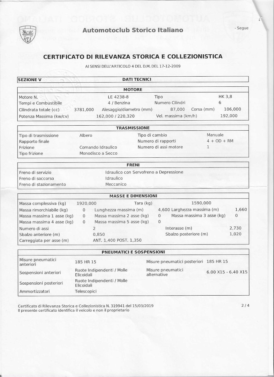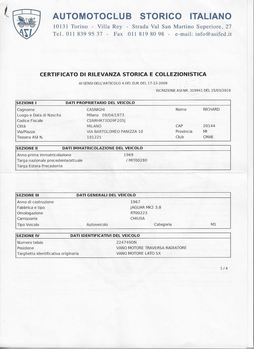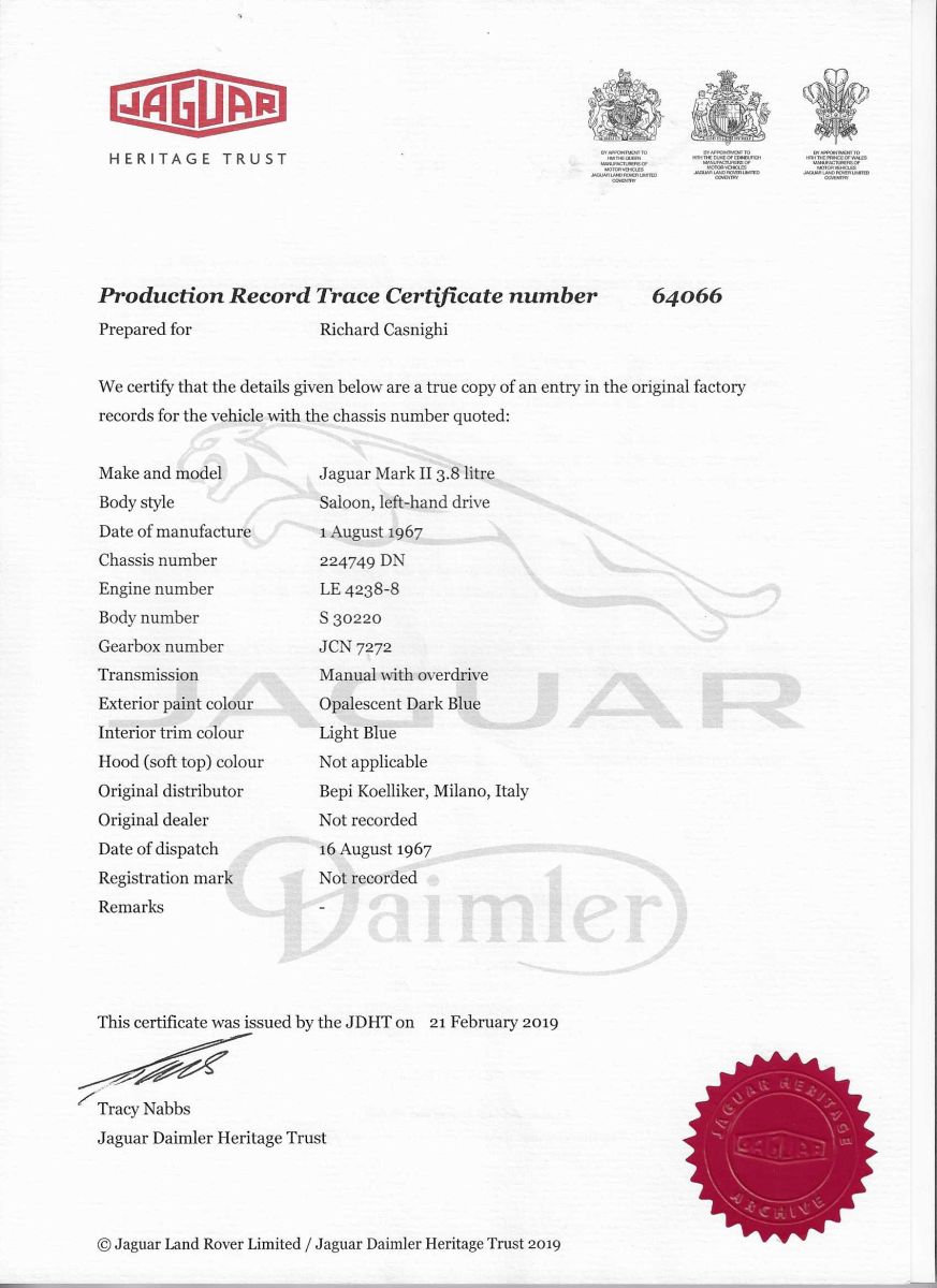 Nel 2019 ha ottenuto il prestigioso Jaguar Heritage Trust Certificate, che attesta la completa corrispondenza tra numeri di telaio, motore, colori e allestimento originale di fabbrica. Nello stesso anno, è stato emesso anche il Certificato di Rilevanza Storica ASI, fondamentale per accedere ai benefici riservati ai veicoli d’epoca (esenzioni fiscali, assicurazione agevolata, libera circolazione ove previsto).