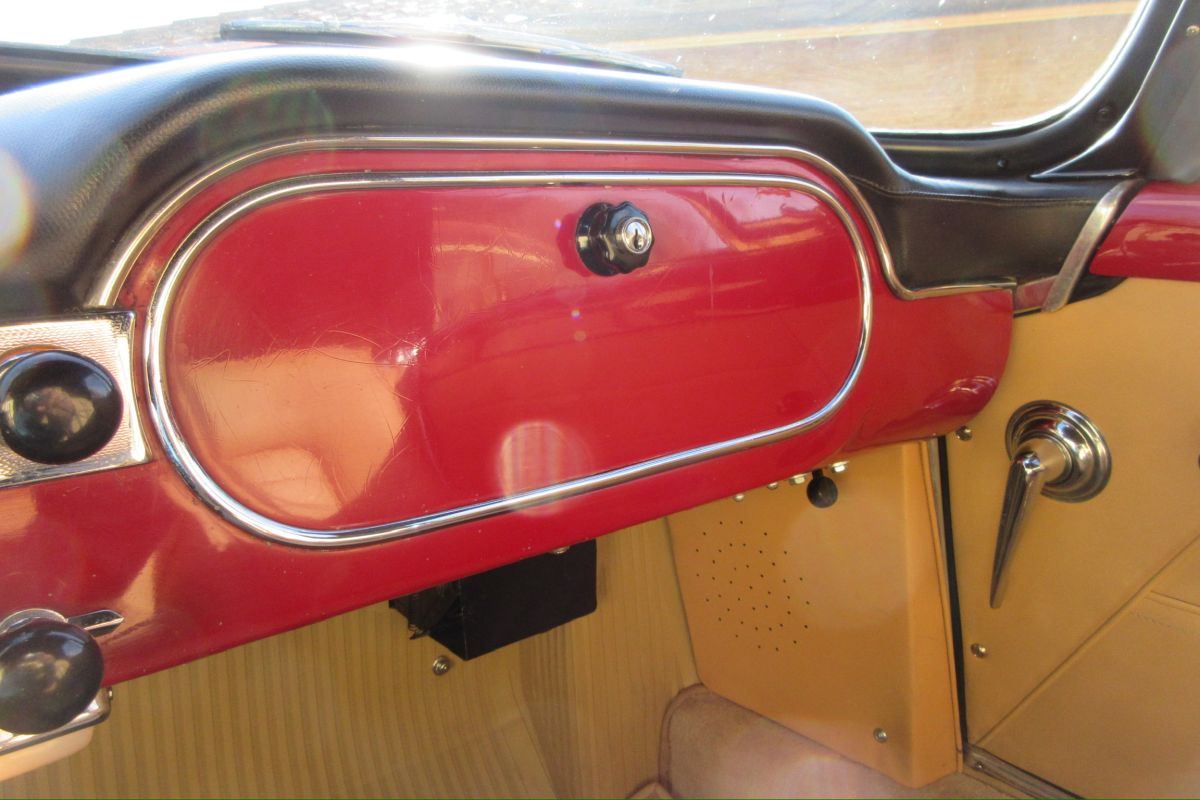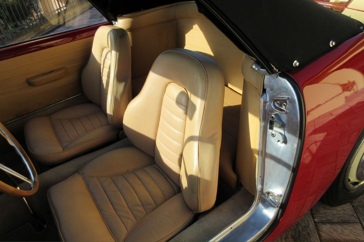 Gli interni in pelle beige sono stati restaurati preservando i materiali e le specifiche originali, mentre la carrozzeria è rifinita nel ricercato Rosso Arcoveggio. La capote è nuova.