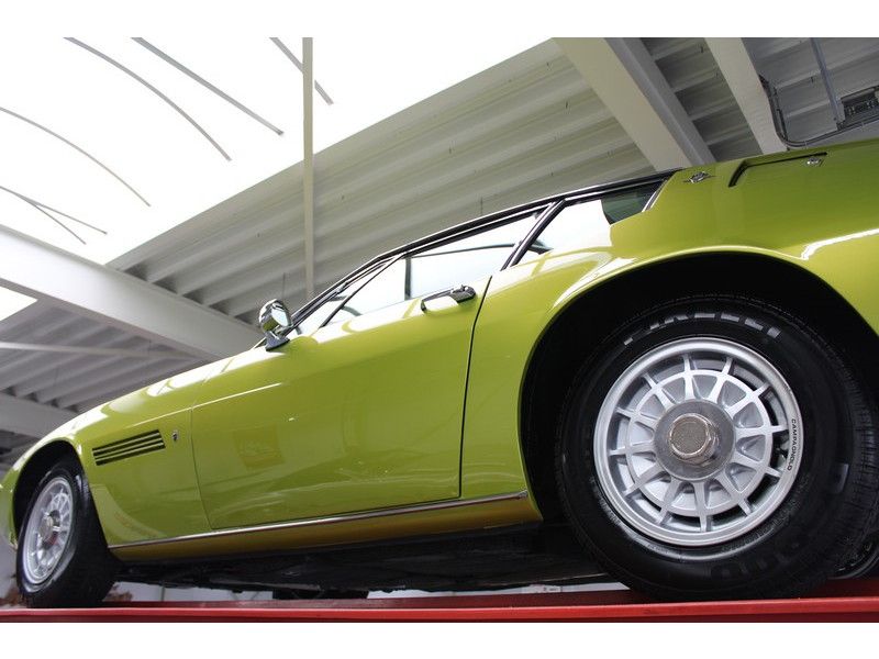 The car sits on beautiful Campagnolo wheels with good tires. The green paint is in very good condition, and the body is beautifully original with nice sheet metal and correct fittings. The chrome work is also in excellent original condition. The leather has developed a beautiful patina over the years, contributing to the original look of this Maserati Ghibli. The wooden steering wheel and original carpets are also in good condition.