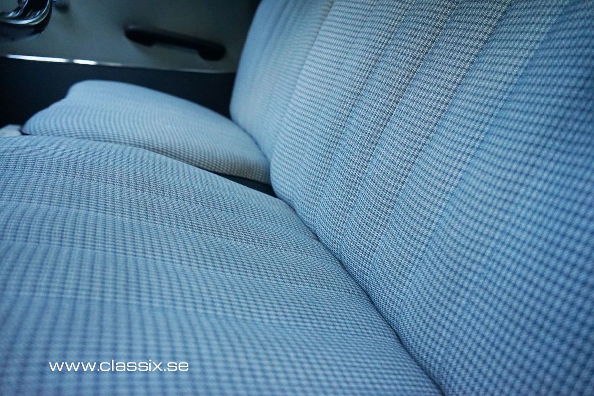 Interior: Inside the Mercedes 190b it is as if time stood still. The car was ordered with extra Mercedes blankets to lay on the seats, and they have been there since the car was new. The headliner is all original and without stains. Every little chrome detail inside this Mercedes is like new. Those very difficult plastic panels on the dashboard and around the windscreens are also perfect, since the car was always stored in a garage away from sunlight. The Mercedes 190b still has the original rubber mats in perfect condition. All instruments and switches are in full working order, even the clock. The vintage Mercedes 190 has a blue theme that starts from the inside of the car and continues to the outside. This lovely interior is very visible through the big, clear glass.