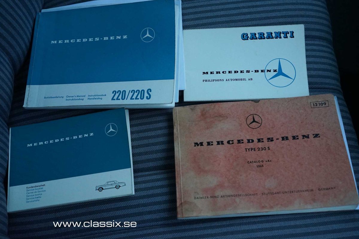 History: This Mercedes 220 Sb was sold new here in Sweden on the 30th of November 1965 to Bengt Gunnarsson (born 1907) It was then past on to his daughter that had the W111 until 1990 and the final owner had the car until 2025. This is a car that has been garage kept pretty much its entire life. And that is the reason for this truly exceptional condition. In 1992 the car received two new front wings and then a full professional repaint. It comes with a binder of invoices for parts and work carried out over the years. Also, many of the Swedish test certificates to verify the low km reading of the car. Original books and tools. Also a very nice original prospect from Mercedes.