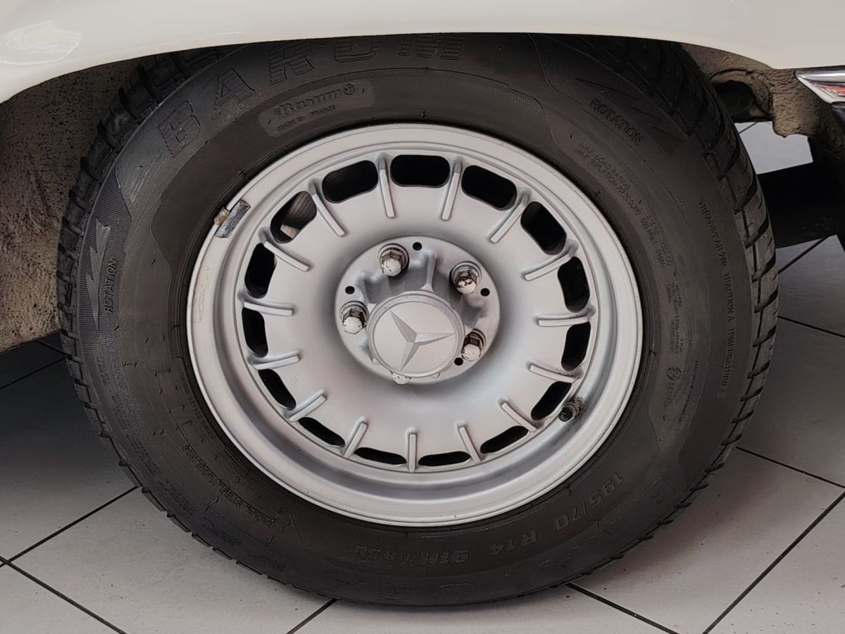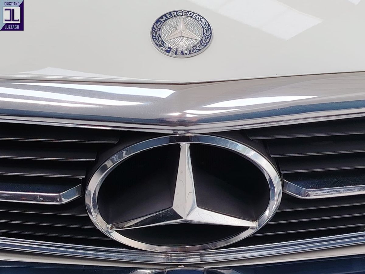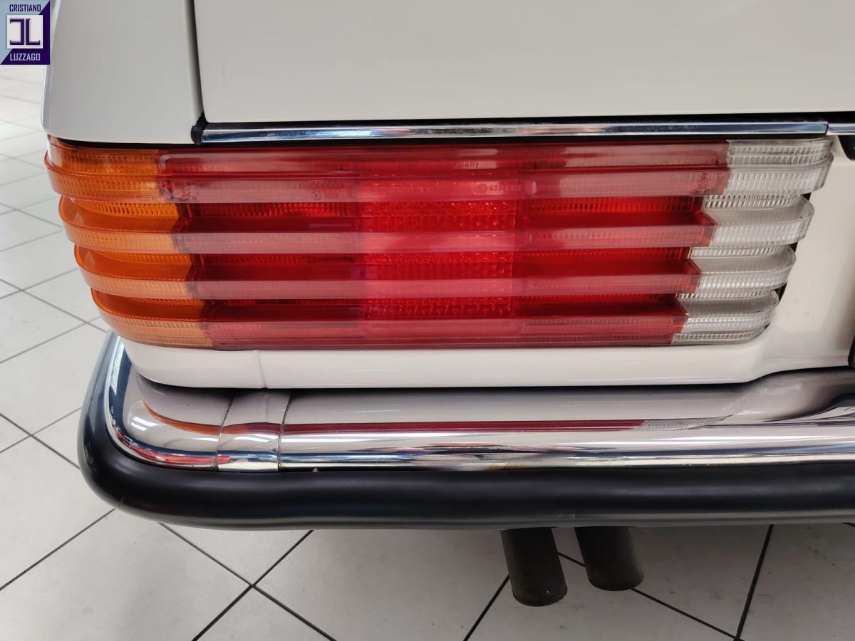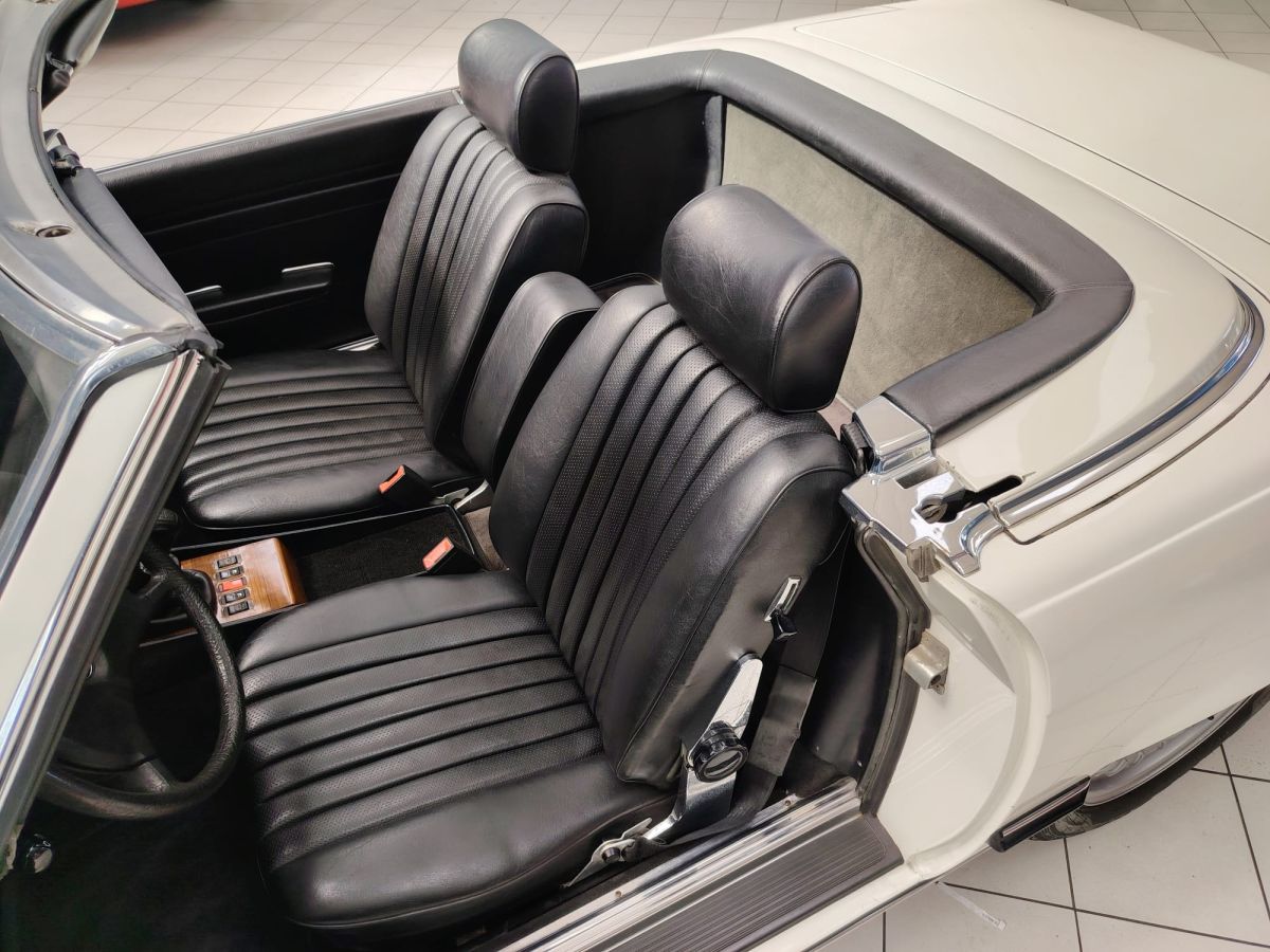 Gli interni in MB-Tex nero sono ben conservati, così come la carrozzeria in elegante livrea bianca, che esalta le linee classiche e senza tempo della R107.