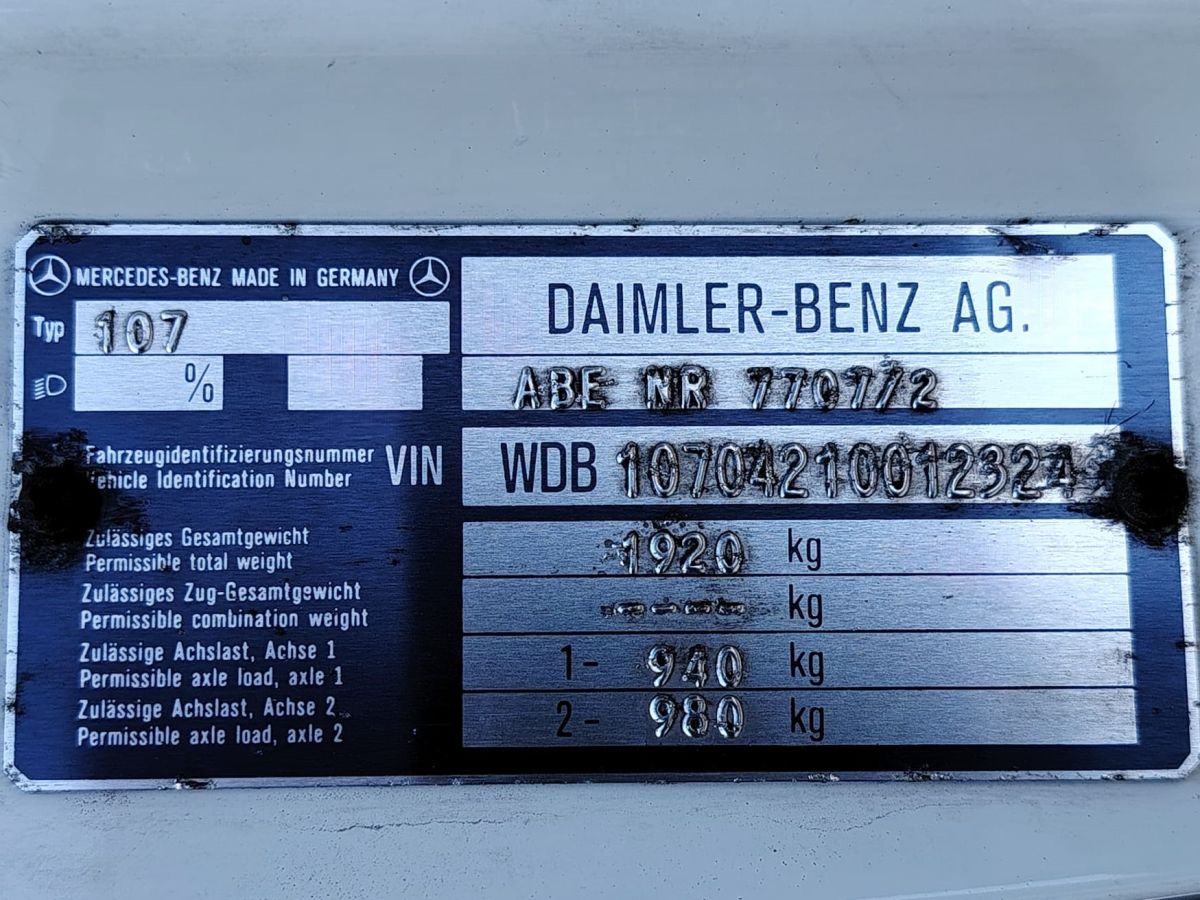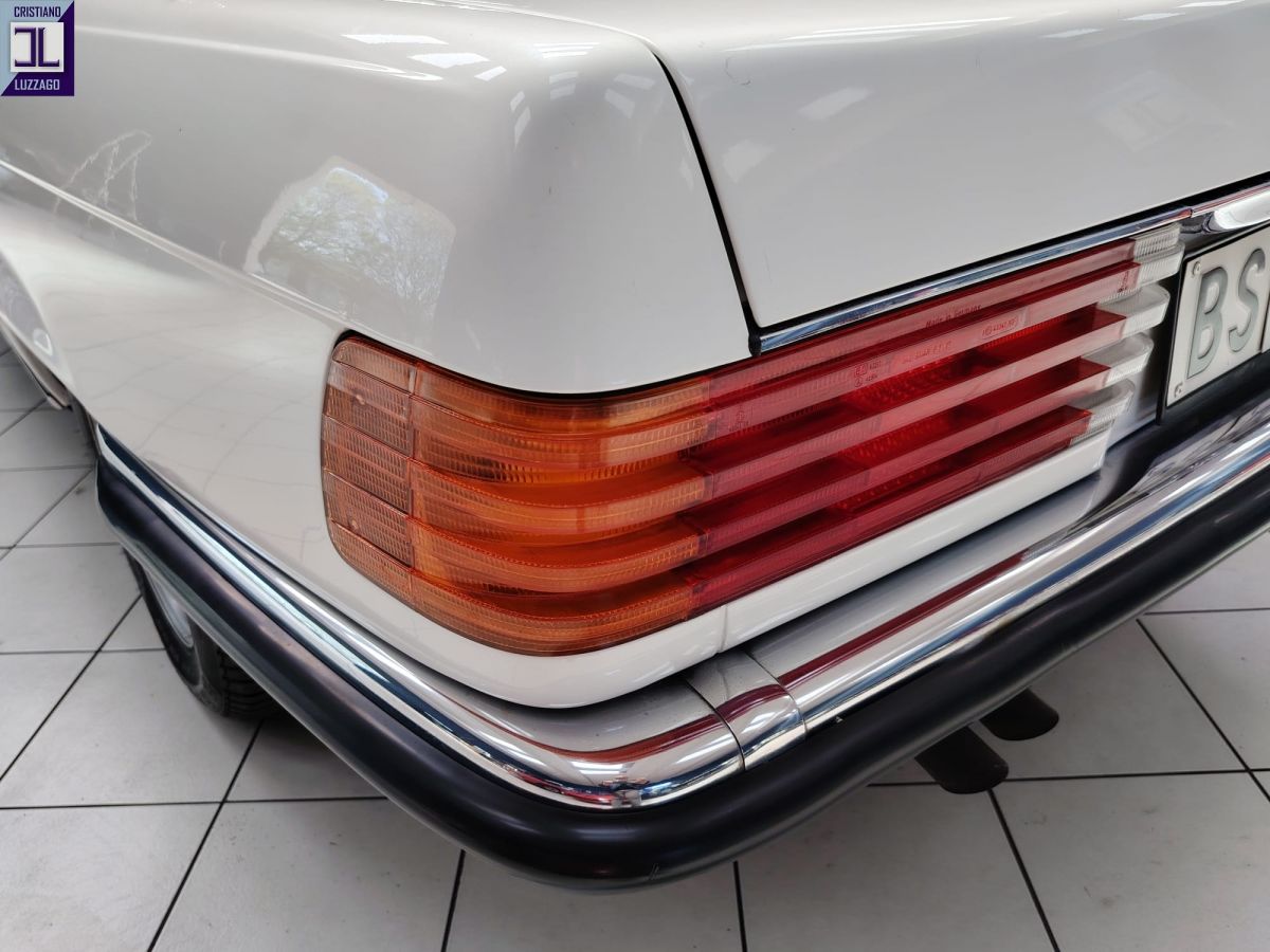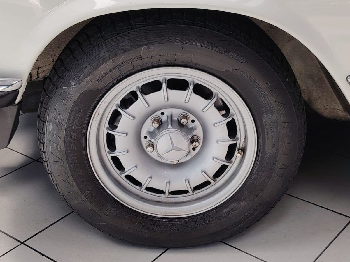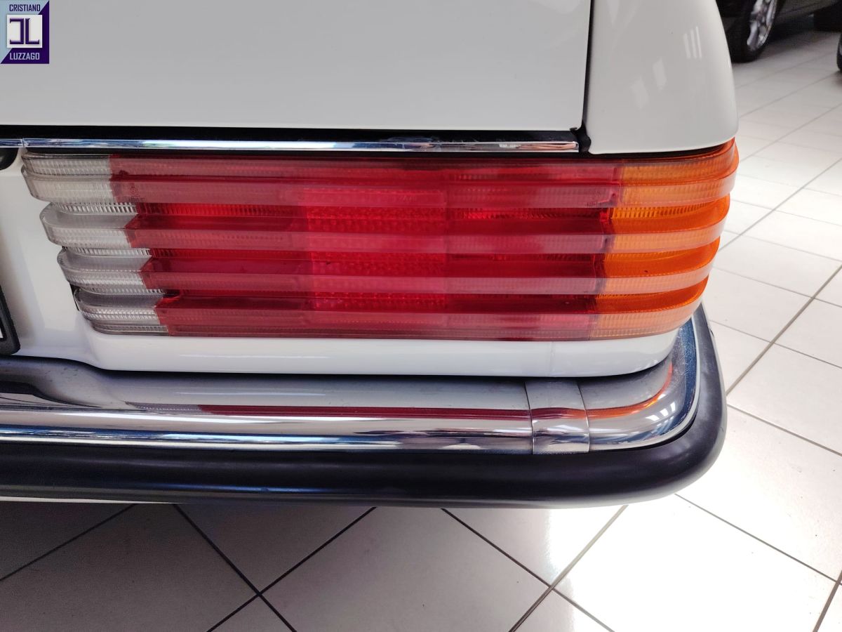 Gli interni in MB-Tex nero sono ben conservati, così come la carrozzeria in elegante livrea bianca, che esalta le linee classiche e senza tempo della R107.