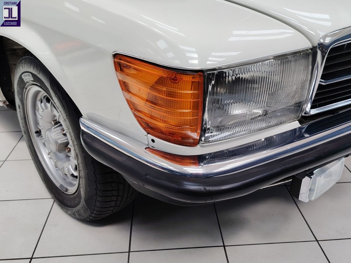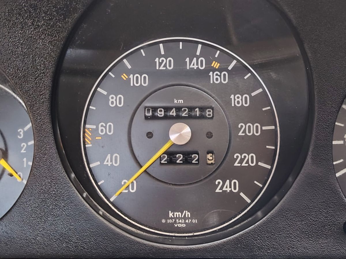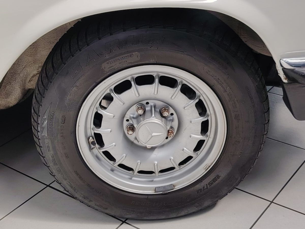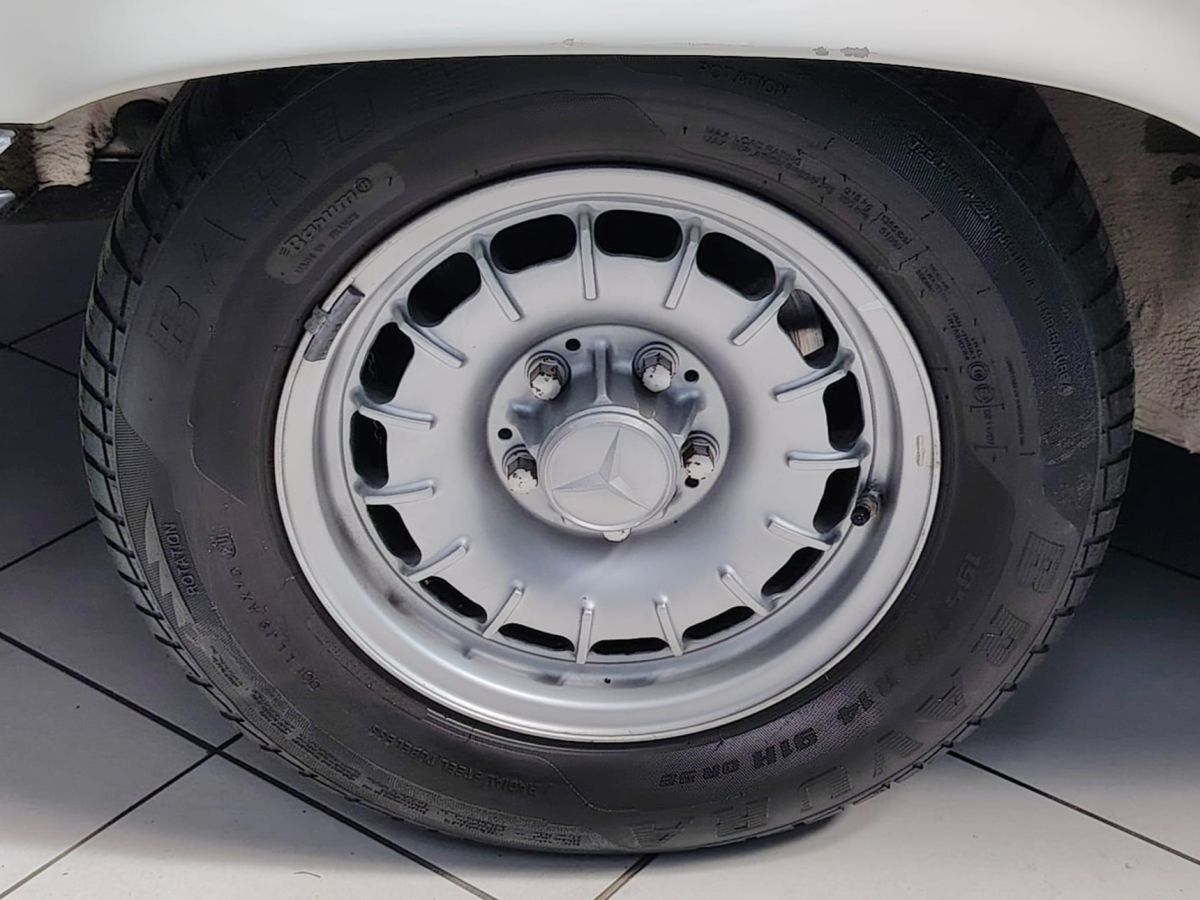 Gli interni in MB-Tex nero sono ben conservati, così come la carrozzeria in elegante livrea bianca, che esalta le linee classiche e senza tempo della R107.
