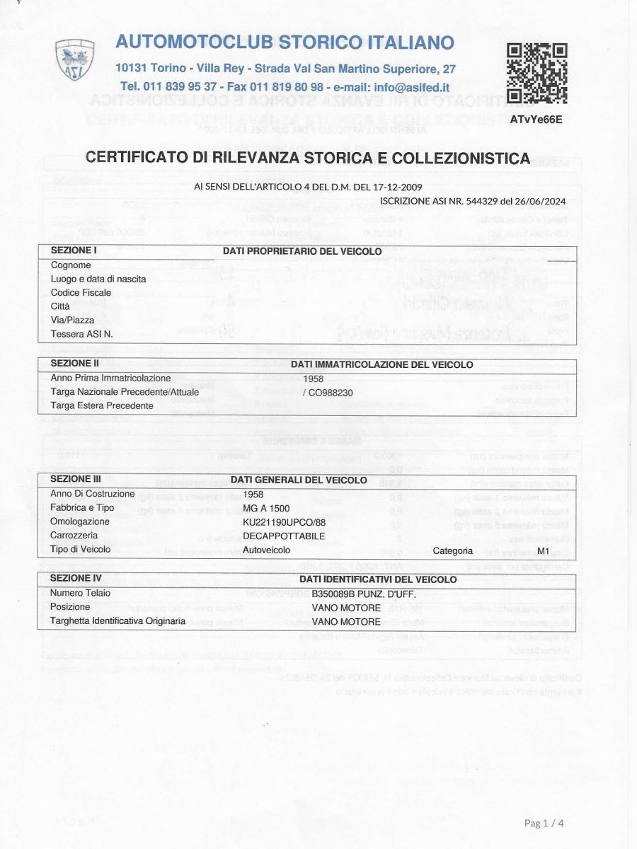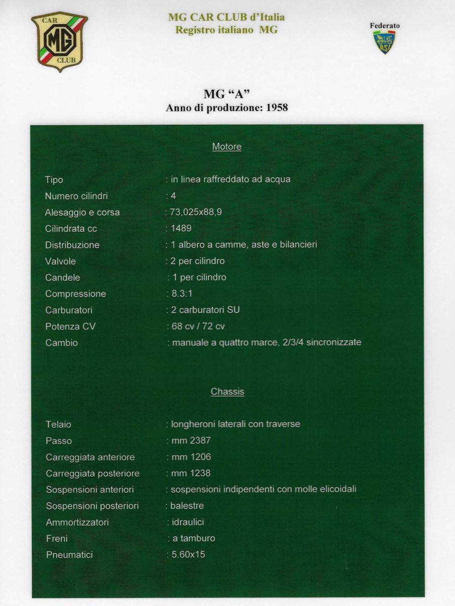 Questa MG A 1500 Roadster del 1958 rappresenta uno dei modelli più iconici prodotti dalla MG. L’auto, contraddistinta dal numero di telaio HDL 43/50089, conserva ancora il numero di telaio originale e la targhetta riassuntiva di fabbrica, elementi particolarmente rari e preziosi nell’ambito del collezionismo. Sebbene al momento della sua immatricolazione italiana – avvenuta il 29 novembre 1988, anno della sua importazione dagli Stati Uniti – sia stato applicato un numero di punzonatura d’ufficio della Motorizzazione Civile, la vettura mantiene dunque integralmente i suoi riferimenti autentici.