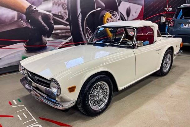 La Triumph TR6 PI è una delle più iconiche roadster britanniche degli anni ’60-’70, prodotta dalla Triumph Motor Company come evoluzione finale della lunga tradizione delle sportive della serie TR2, TR3, TR3A, TR4, TR4A IRS e TR5 . Presentata nel 1968, si distingueva per il design muscoloso e squadrato, firmato da Karmann, che conferiva alla vettura un aspetto più moderno e aggressivo. La sigla PI (Petrol Injection) identificava la versione più prestazionale destinata principalmente al mercato europeo. Era equipaggiata con un motore 6 cilindri in linea da 2,5 litri con iniezione meccanica Lucas, capace di circa 150 CV, una potenza notevole per una spider dell’epoca. Grazie al peso relativamente contenuto (poco sopra i 1.100 kg) e alla trazione posteriore, la TR6 PI offriva prestazioni molto brillanti: raggiungeva una velocità massima di circa 200 km/h e uno 0-100 km/h in circa 8 secondi, rendendola una delle roadster più veloci del suo tempo. Dal punto di vista tecnico e stilistico, si caratterizzava per: telaio a longheroni separato dalla carrozzeria, sospensioni indipendenti anteriori e posteriori, abitacolo sportivo con strumenti completi, linea robusta e tipicamente “british roadster”. La produzione complessiva della TR6, tra il 1968 e il 1976, fu di circa 94.600 unità. Di queste, la versione TR6 PI a iniezione (destinata principalmente all’Europa) fu prodotta in circa 8.300 – 8.400 esemplari complessivi, più rara rispetto alla maggioranza delle TR6 costruite, che montava infatti motori a carburatori per il mercato nordamericano, rendendo oggi la variante PI decisamente più rara e ricercata tra gli appassionati.