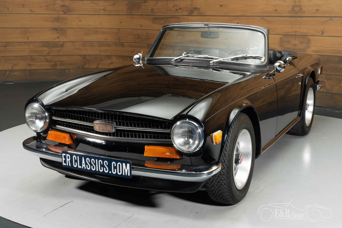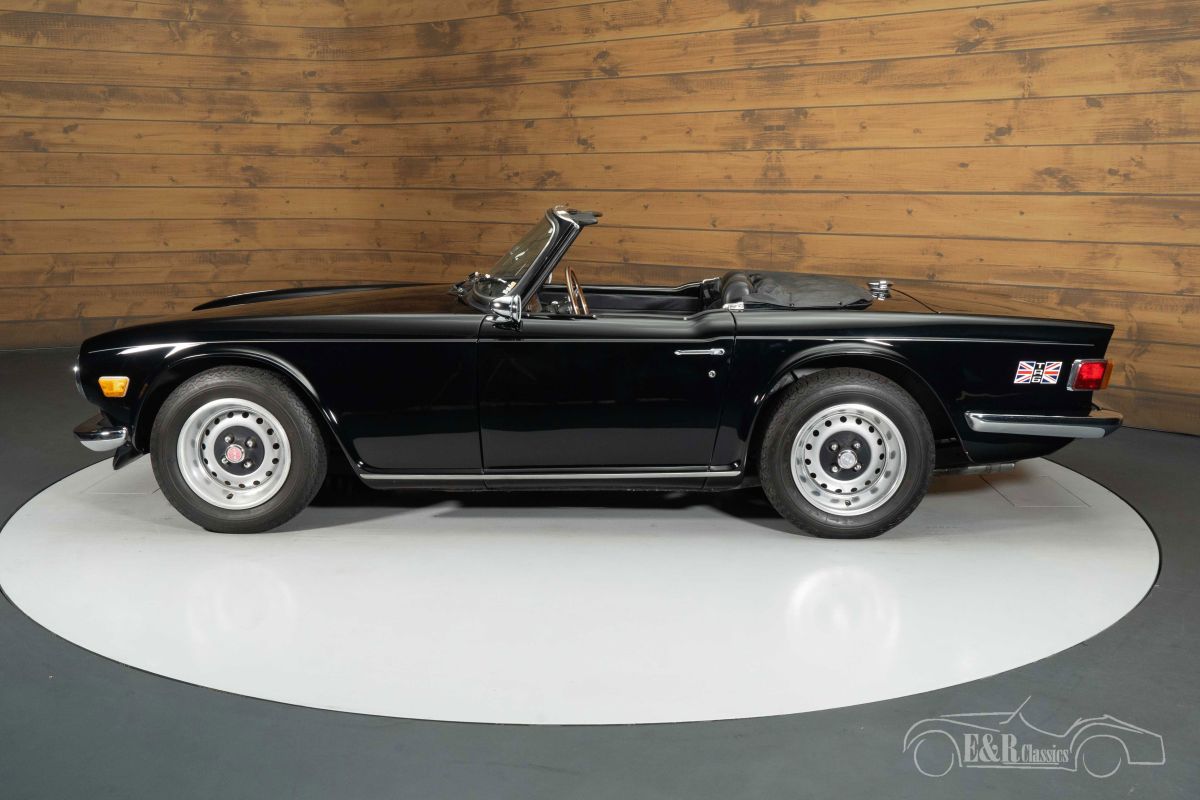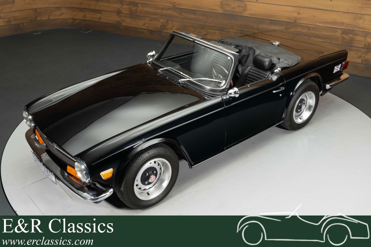 Triumph TR6 | Restored | Triple Black | History known | 1971 Highlights: - Restored - Triple Black - Maintenance history known - 14 years 1 owner - Various technical upgrades Restored Triumph TR6 with service history for sale We offer for sale this beautiful Triumph TR6 from 1971. This Triumph comes from an ERclassics customer who exchanged the classic for another car. The previous owner had the TR6 for no less than 14 years and the invoices for the maintenance performed have been neatly preserved. The Triumph TR6 has been restored in the past and a photo report of the restoration is available. It is powered by a 2500cc 6-cylinder engine that provides a driving experience like never before with the great sound. The TR6 also has a number of technical upgrades such as a new front wheel suspension, suspension and rear axle, aluminum fuel tank, overhauled cooling system and a new radiator. Triumph TR6 in Triple Black for sale What distinguishes this Triumph TR6 from other classics is its beautiful colour scheme. You often come across a TR6 in green or red, but the deep black paint of this classic gives the TR6 a really distinctive character. Together with the black interior and black soft top, this so-called Triple Black TR6 really makes a statement. The interior has recently been partly renovated and equipped with new seat covers and foam. Lower the soft top, grab the Moto-Lita steering wheel, turn the key and enjoy this great British Classic Car. Want to buy Triumph TR6? Are you looking for a restored 1971 Triumph TR6? Leave your details via the contact form on this page or call us directly on +31 416 751 393. Our salespeople will be happy to answer all your questions or even make a personal shop video for you. We can help with transport. Within Europe you do not need to pay any import duties. Trading in, buying and consignment possible. In some countries we can help with financing. Ask our sales staff.