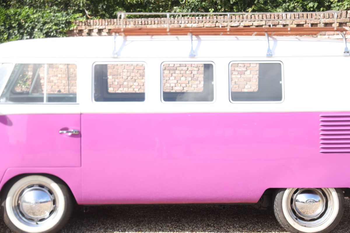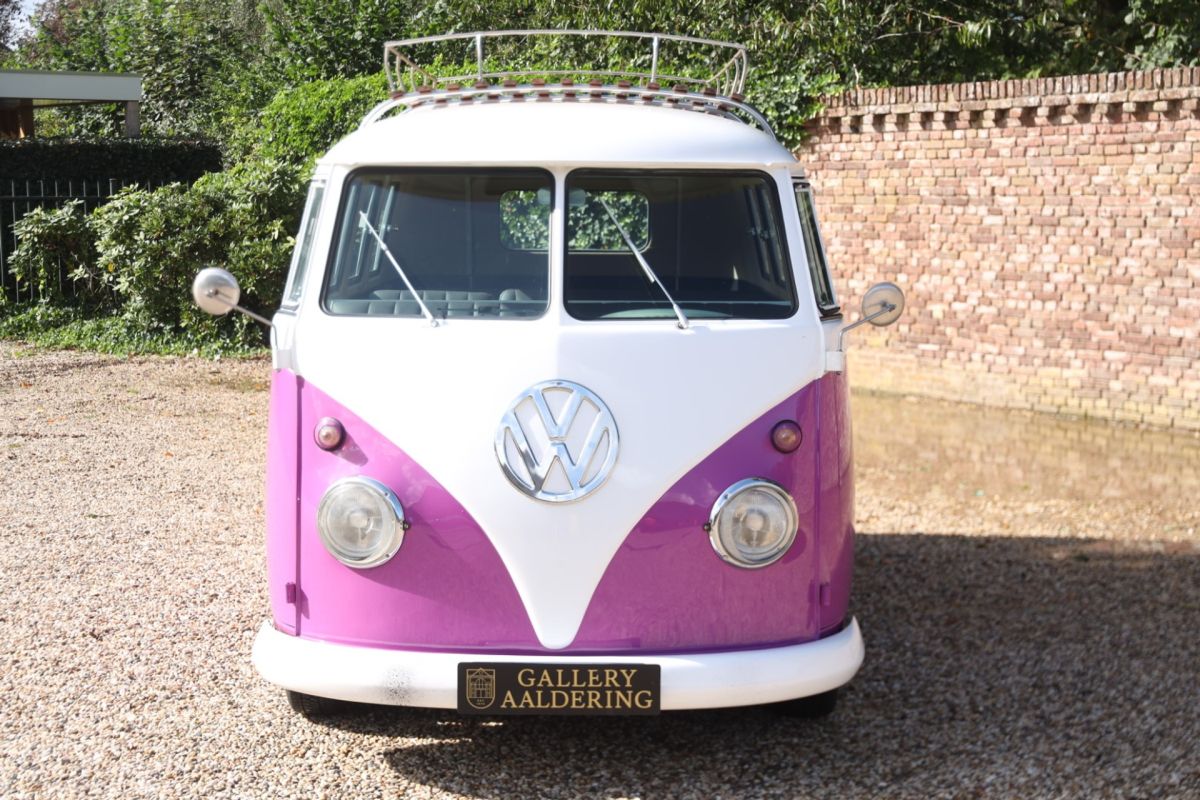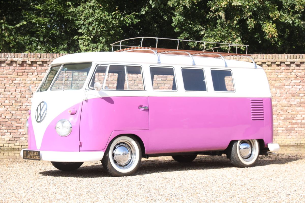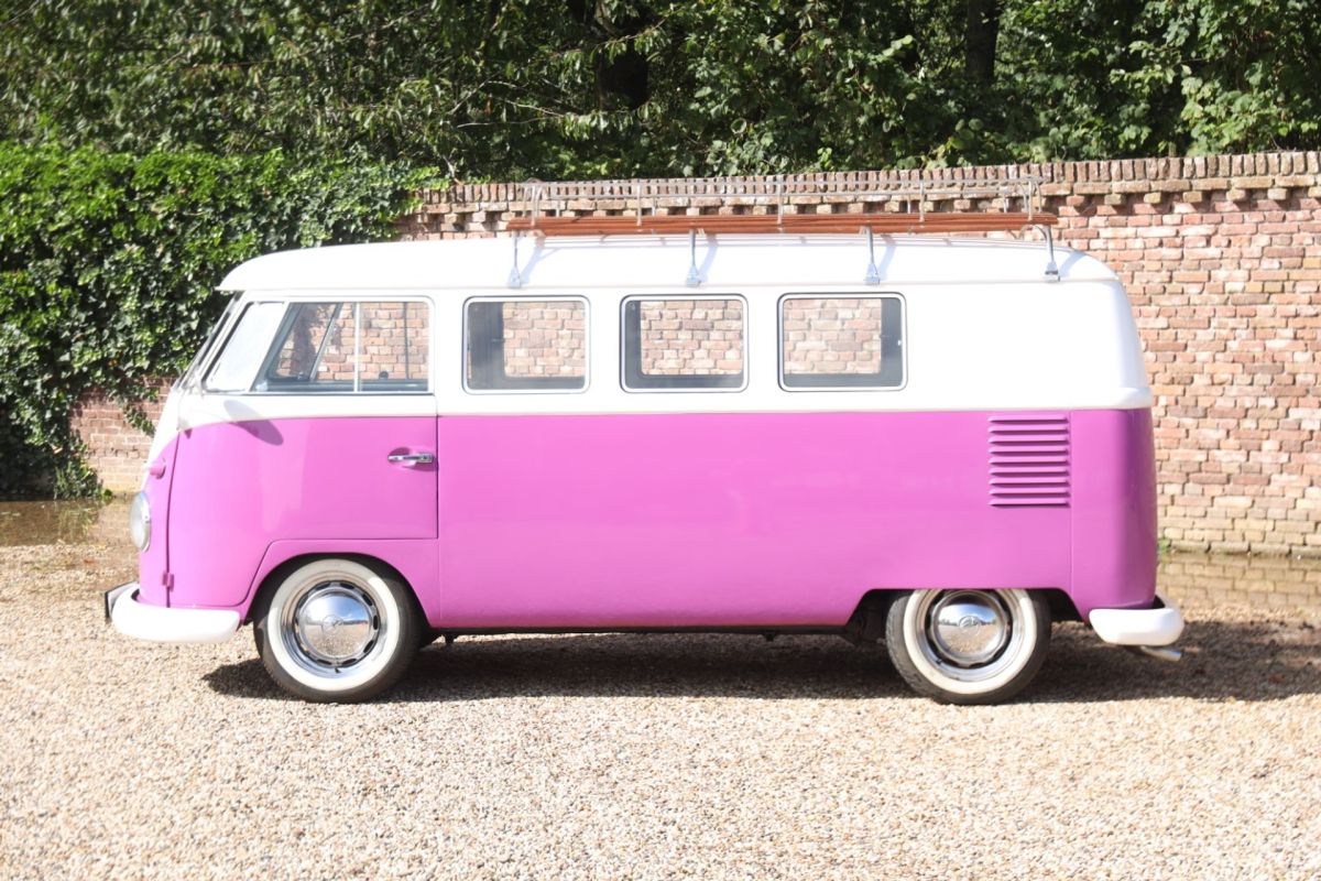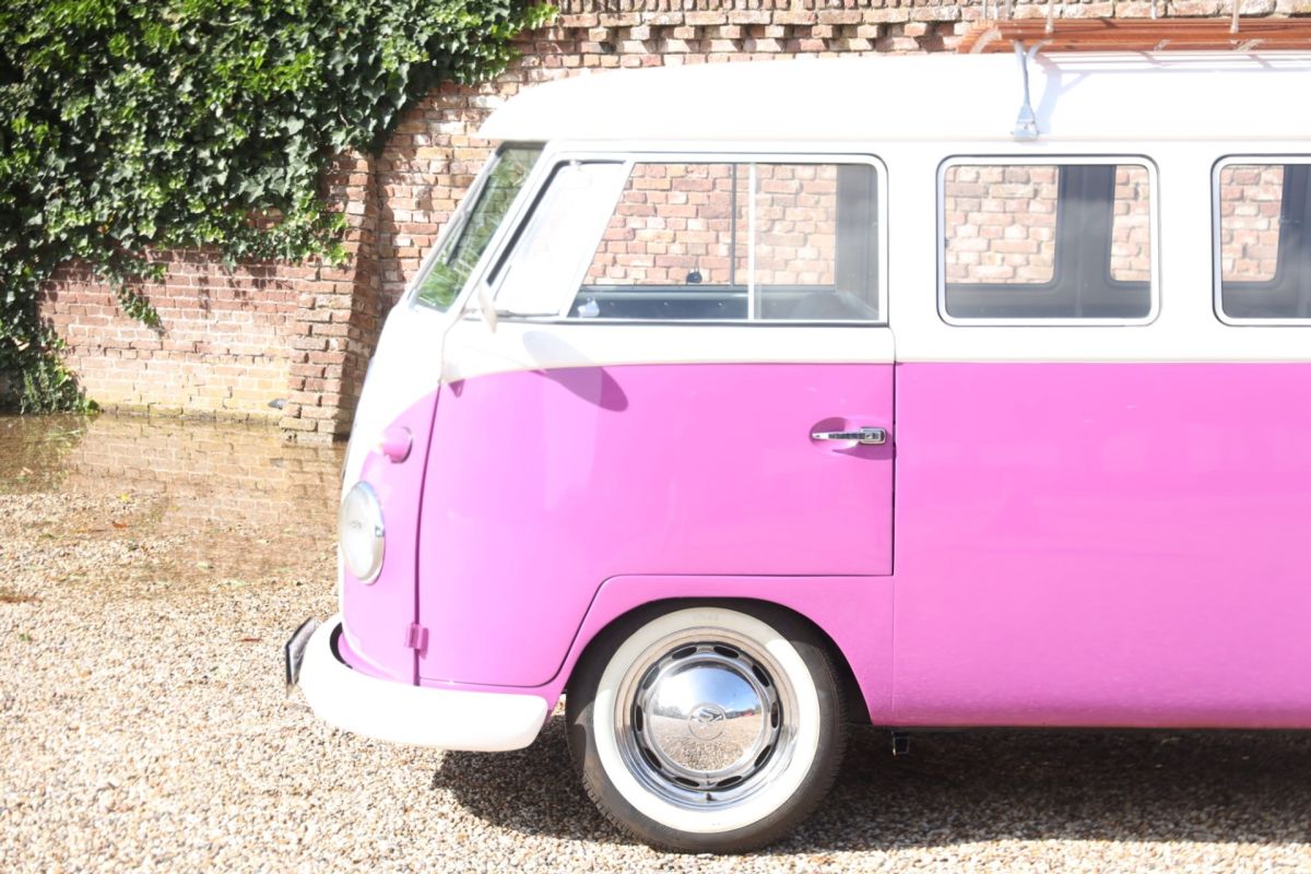 This 1958 example is the result of a carefully executed older restoration. It is an 11-window Combi, restored with meticulous attention to detail and authenticity by a Dutch enthusiast. The result is a bus that fully retains the charm of the classic T1 while standing out with its vibrant and lively appearance: an exterior in white complemented by an amethyst-colored top, a combination that immediately draws attention and perfectly suits the iconic character of this Microbus.