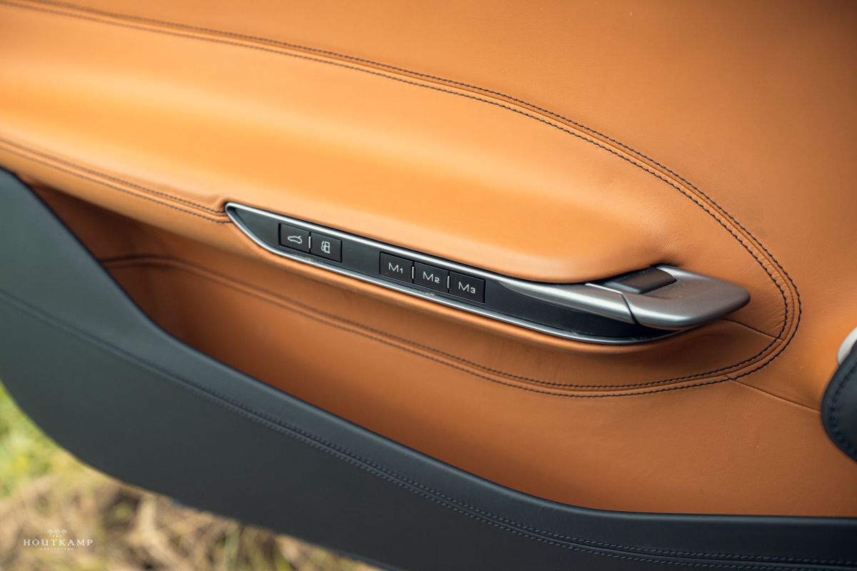 The interior is upholstered in exquisite Cuio leather, a warm caramel tone that perfectly complements the cool exterior.