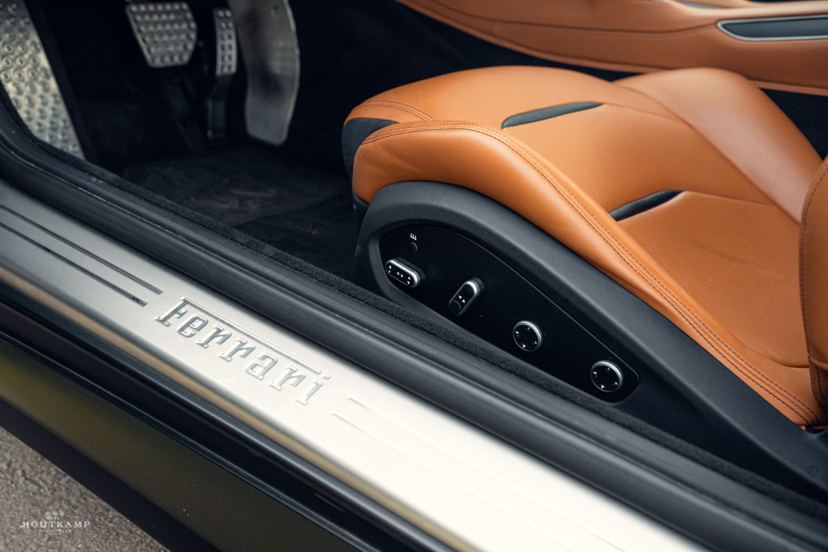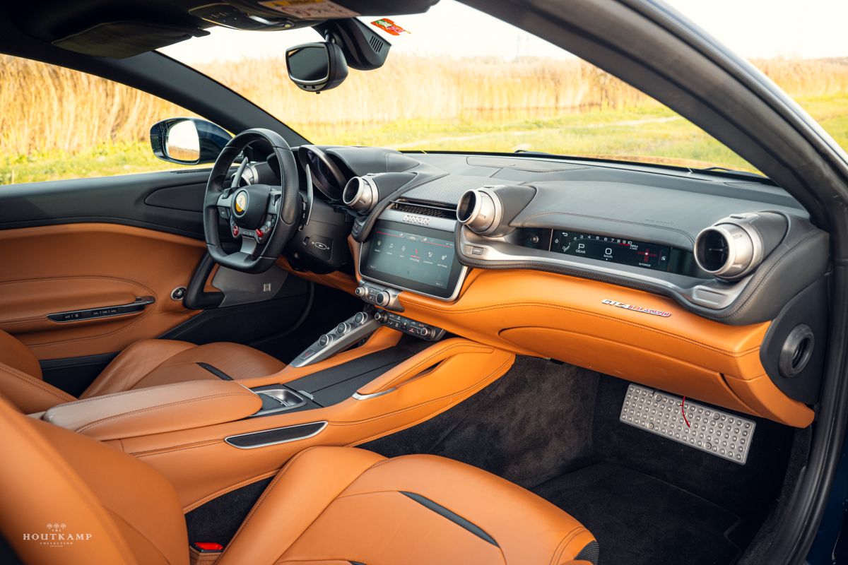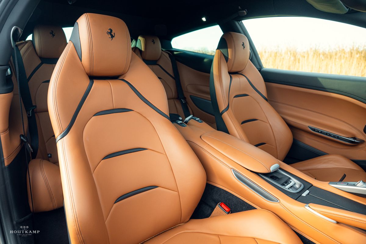The interior of this Ferrari GTC4 Lusso is pristine, with luxurious leather upholstery showing minimal signs of wear, and all the dashboard and trim elements are in excellent shape, free from any scuffs or blemishes.