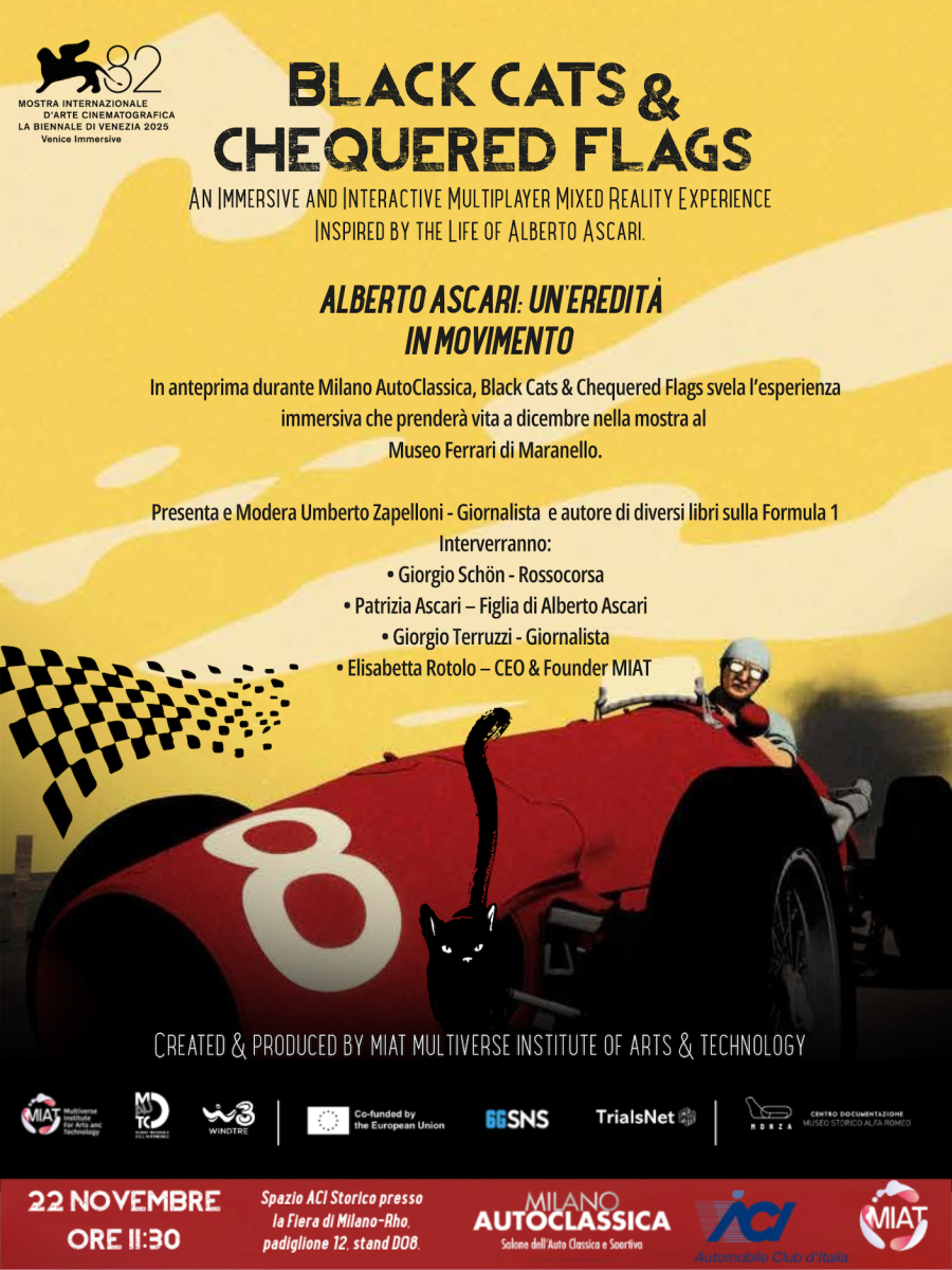 Selezionato in competition alla 82ª Mostra Internazionale d’Arte Cinematografica di Venezia – Venice Immersive 2025, il progetto fonde arte, tecnologia e memoria sportiva in una mixed reality experience che a dicembre prenderà vita nella mostra dedicata ad Ascari al Museo Ferrari di Maranello. “Black Cats & Chequered Flags” è una produzione di MIAT – Multiverse Institute for Arts and Technology ed è un tributo al brivido della velocità e alla vulnerabilità umana dietro al mito sportivo. A presentare e moderare l’evento sarà Umberto Zapelloni, giornalista e autore di numerosi libri sulla Formula 1.