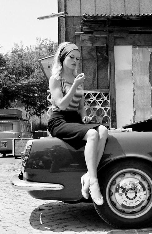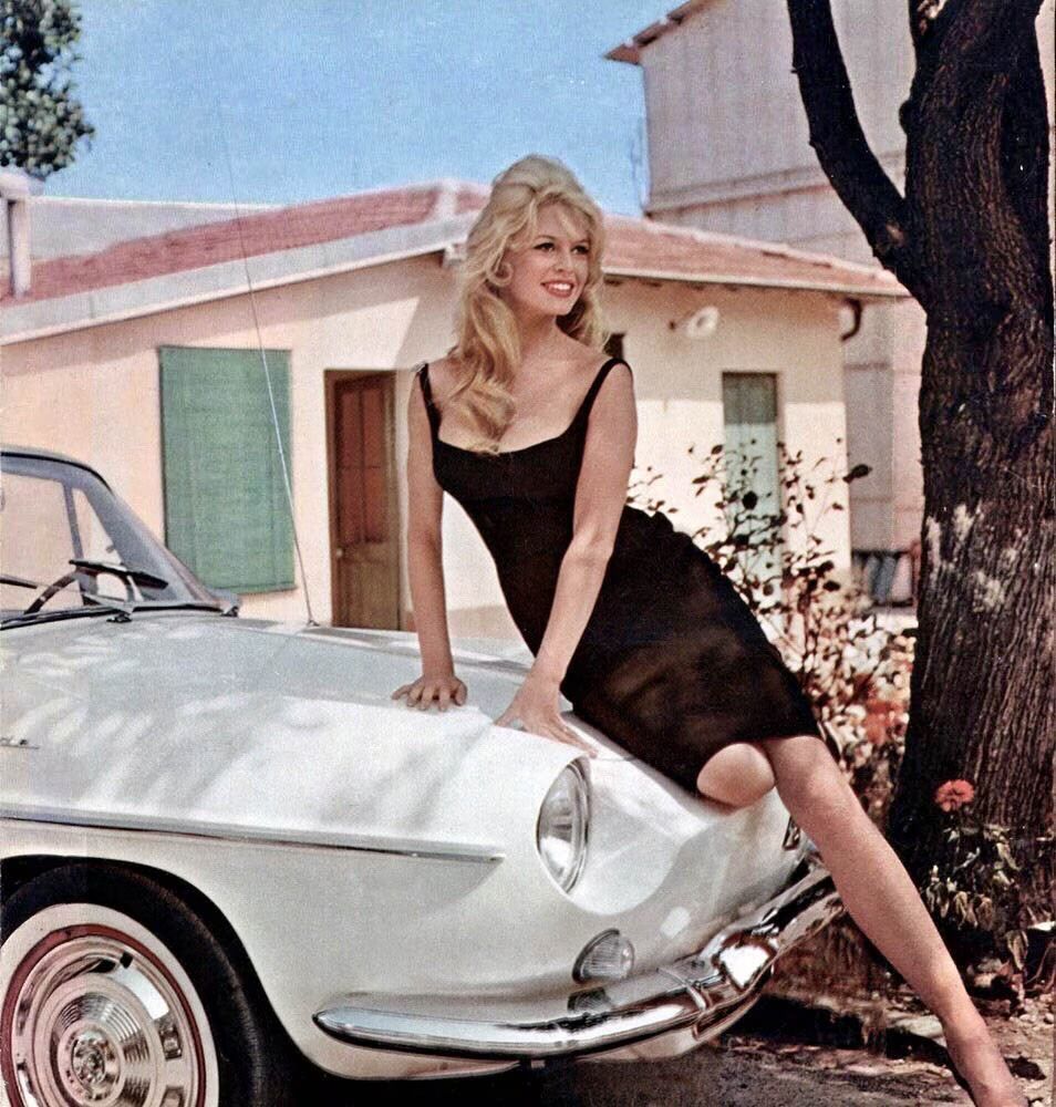 Ovviamente, Brigitte Bardot la vediamo al volante di un’auto francese, la Renault Floride, l’elegante spider del 1958.