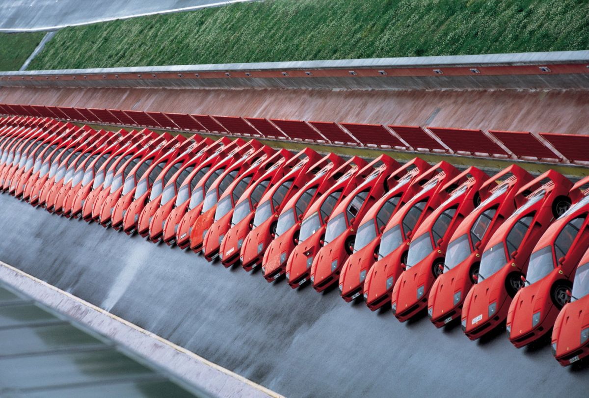 Destinata inizialmente a essere prodotta in numero limitato, stravolse le previsioni, fino a superare di gran lunga il traguardo delle 1000 unità, diventando il sogno proibito di sportivi e collezionisti di tutto il mondo e persino oggetto di speculazioni di merca-to. In questo periodo lazienda è una vera industria che produce 3902 auto l'anno, con 1773 dipendenti. Se nel motore si era partiti dall'8 cilindri, rivisto completamente e trasformato con l'adozione di due turbo giapponesi, il resto è frutto di una lunga ricerca sulle strutture, sui materiali, sull'aerodinamica e sul trasferimento delle tecniche della Formula | nella produzione. Risultato: una "berlinetta" sempre disegnata alla Pinin-farina, un punto fermo nell'evoluzione delle Ferrari e delle sportive in generale. Domina nella F40 il grande alettone posteriore, deportante e stabilizzante in velocità, garanzia del trasferimento al suolo della sua potenza esagerata e prova anche dell'accurato studio aerodinamico del fondo vettura piatto, che grazie alla depressione creata realizza un "effetto suolo" determinante per l'aderenza e la stabilità del veicolo. Le dimensioni della F40 sono abbastanza compatte: 4358 mm di lunghezza e 1970 di larghezza. "Vettura eccezionale"': così l'hanno definita tutti coloro che vi hanno lavorato in assoluta libertà nell'individuare le soluzioni. Progettata e costruita in soli 13 mesi, con altri due prototipi presentati nel luglio 1987, è un'auto da corsa "stradalizzata", una sportiva globale, e per questo è definita nei più piccoli dettagli.